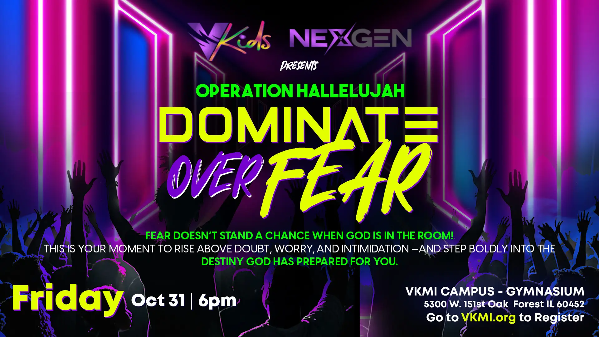 Home Events - Valley Kingdom Ministries International OH 2025 OH 2025 VKids & NexGen Youth MinistryPresents: Operation HallelujahTheme: “Dominate Over Fear” ๐๐พย โจ Glow in the Dark Party๐ Time: 6:00 PM๐ Location: Multipurpose Room๐ Dress Code: Wear ALL WHITE to glow!ย Come ready for fun, faith, and fearless energy as we shine bright in the dark! 00 days 00 hours 00 minutes 00 seconds ยฉ 2020 Valley Kingdom Ministries International. All Rights reserved. Web designed:ย TS Design Studio
