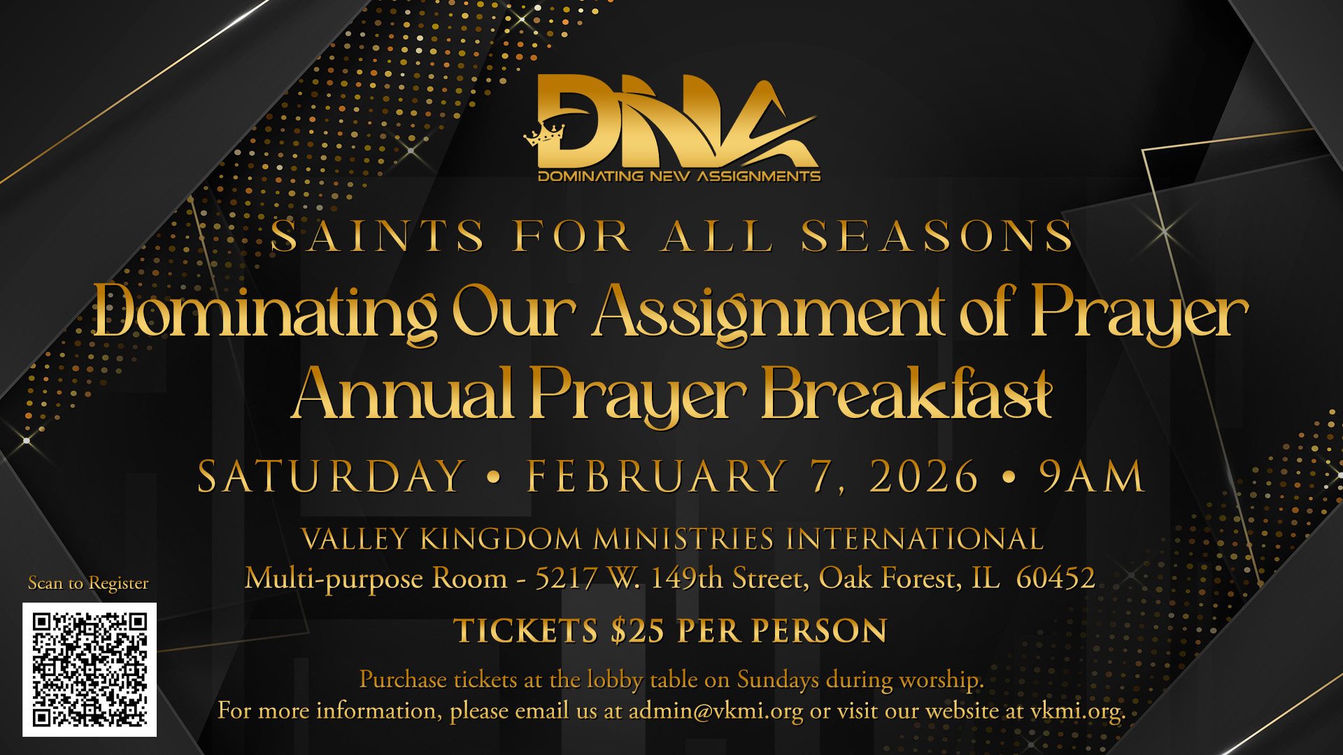 Home Events - Valley Kingdom Ministries International Saints For All Seasons: Prayer Breakfast Saints For All Seasons: Prayer Breakfast “Dominating Our Assignment of Prayer!” Join us for an empowering prayer breakfast where all ages are welcome to come together in prayer and experience the power of unity. Don’t miss out—purchase your tickets today and be part of this powerful time of prayer and empowerment! Tickets are $25 per person and all ages are welcomed See one of the Saints for all seasons volunteers for your ticket. Purchase Tickets © 2020 Valley Kingdom Ministries International. All Rights reserved. Web designed: TS Design Studio